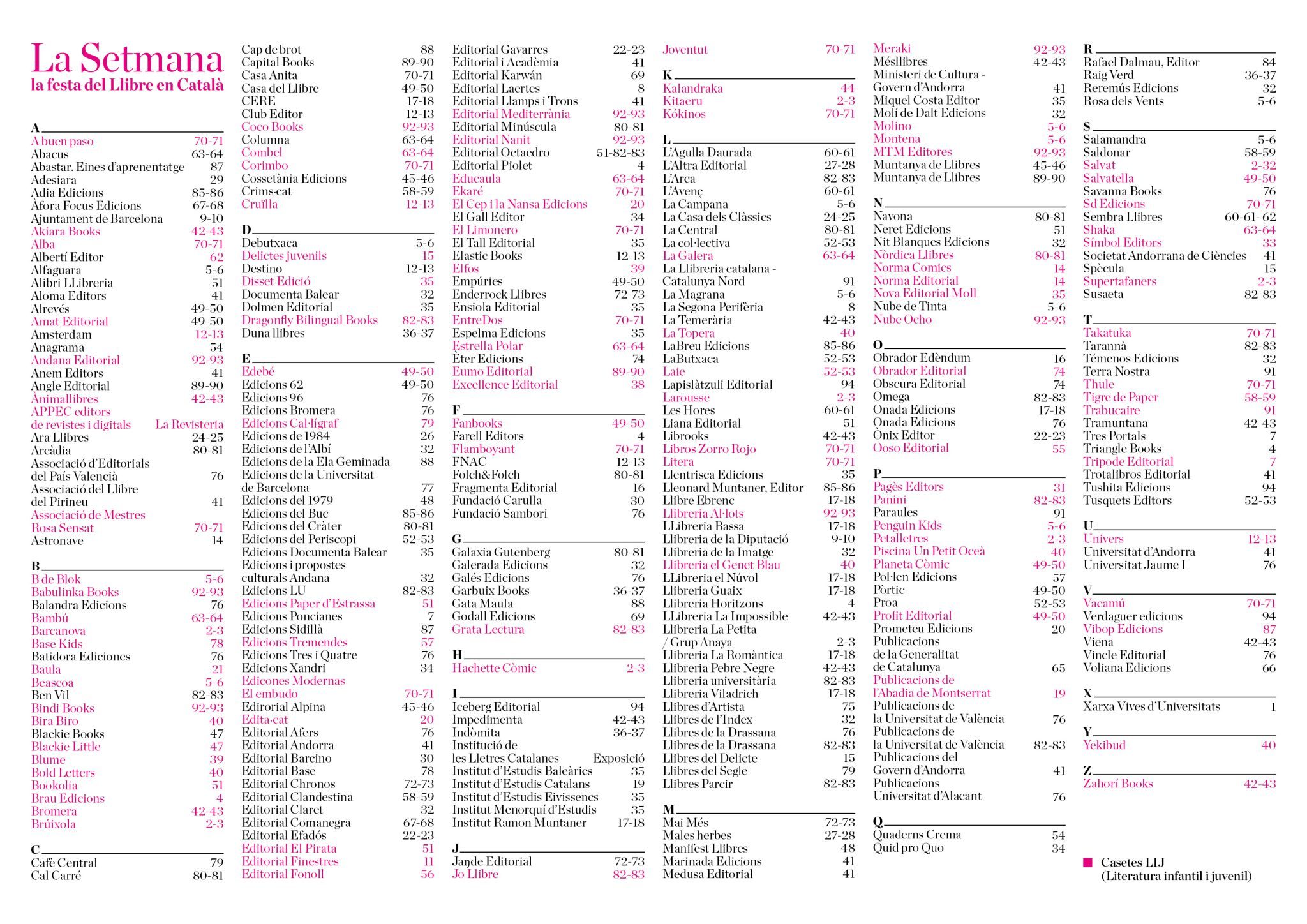 Aquí el llistat d’editorials presents a “La Setmana” (Fira del llibre en català) que va es va fer al Passeig Lluís Companys del 19 al 28 de setembre d’enguany.